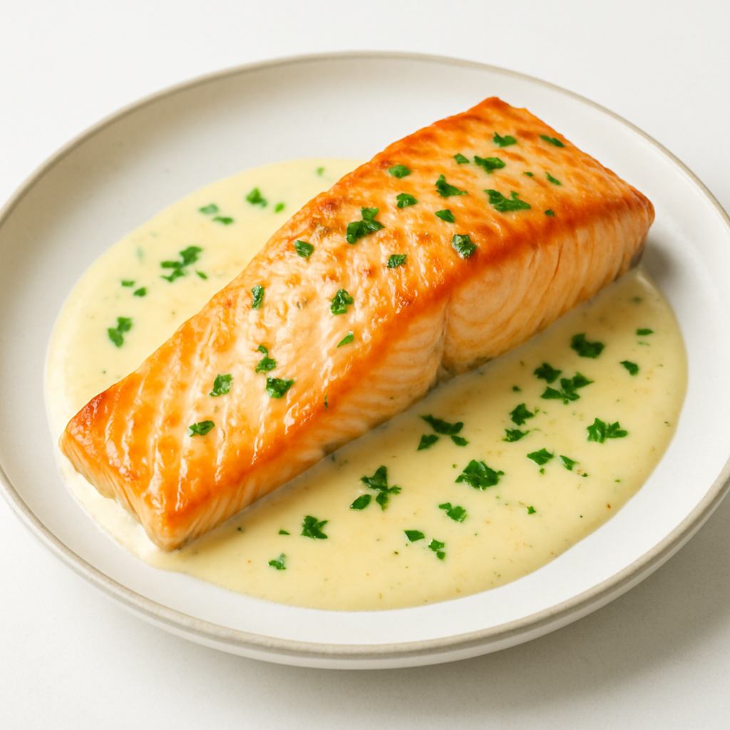 Short description: Tender salmon fillet served in a light, creamy herb sauce. A balanced, protein-rich dish with silky texture and clean, satisfying flavor.
